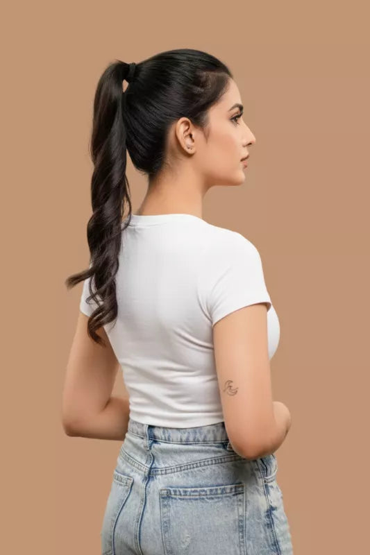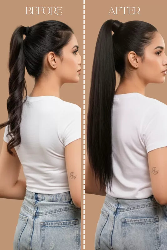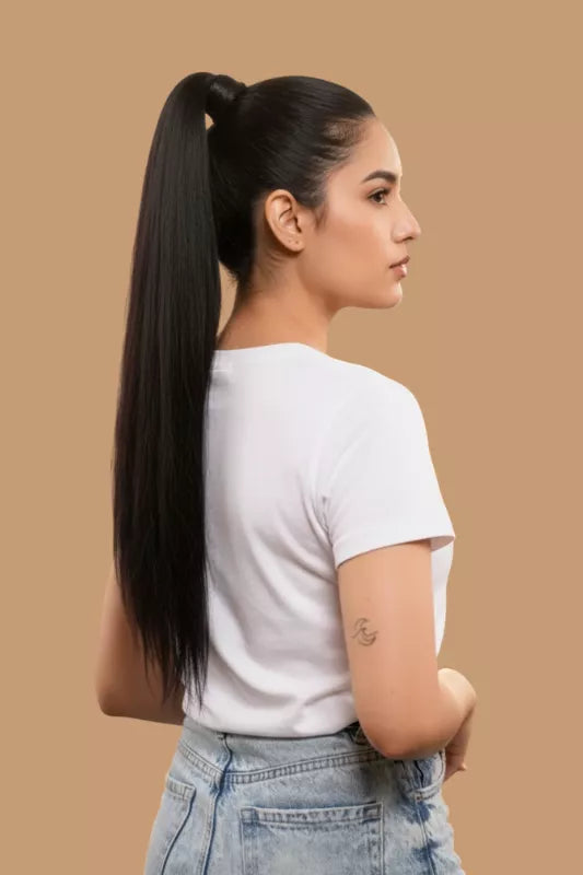 Celebrity Style Ponytail – your ticket to instant glamour! This luxurious wrap-around 18 inch long ponytail boasts extra security with an additional clip, ensuring a flawless, worry-free fit. Crafted from long, thick hair, it radiates quality and sophistication. Whether you prefer sleek and chic or tousled and voluminous, this versatile ponytail allows for endless styling possibilities. Elevate your look effortlessly and unleash your inner celebrity with our Celebrity Style Ponytail – because every day is a red carpet moment!